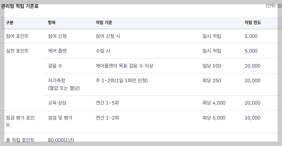 관리형은 고혈압·당뇨병 환자처럼 지속적 관리가 필요한 대상에게 제공되는 유형으로, 1년간 최대 80,000점까지 적립할 수 있습니다. 주치의 기반 케어플랜, 자가측정, 상담·교육을 중심으로 포인트가 부여되며, 단순 실천뿐 아니라 의료적 관리 요소가 강조된 것이 특징입니다.