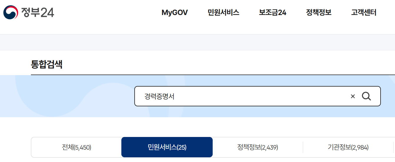 - 검색창에 "경력증명서" 입력 후 해당 서비스 선택