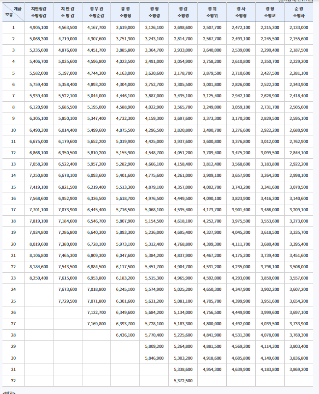 아래는 계급별 1호봉 기준 월 기본급입니다.
