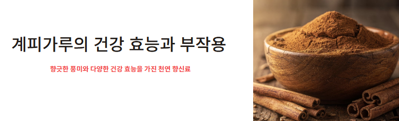 계피가루는 향긋한 풍미와 함께 다양한 건강 효능으로 주목받는 천연 향신료입니다. 계피가루 효능과 부작용은 혈당 조절, 면역력 강화, 체지방 감소 등 여러 건강 효과로 꾸준히 관심을 받고 있습니다.