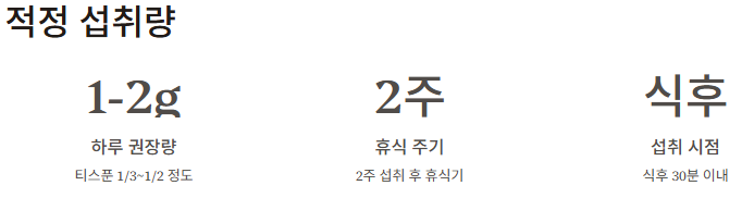 일반적으로 하루 1~2g 정도가 적정량이며, 티스푼 기준 약 1/3~1/2 정도입니다. 꾸준히 섭취하되, 2주 단위로 휴식기를 갖는 것이 좋습니다.