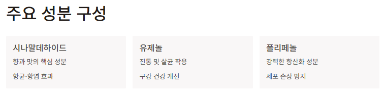 - 주요 성분: 시나말데하이드, 유제놀, 폴리페놀