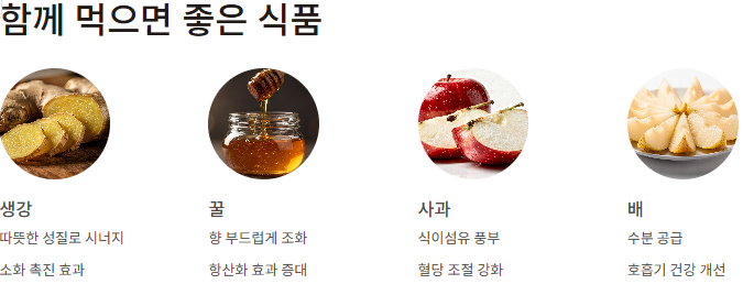생강, 꿀, 사과, 배처럼 따뜻한 성질의 식품과 함께 섭취하면 향이 부드러워지고 항산화 효과가 높아집니다.
