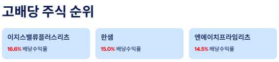 - 고배당주 상위권은 리츠·금융주 중심 (시가배당률 7~16%)