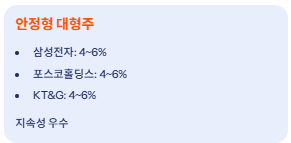 또한 삼성전자, 포스코홀딩스, KT&G 등 대형주들도 배당 안정성이 높아 ‘고배당 안정형 종목군’으로 분류되며,