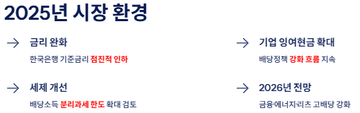 2025년 한국은행의 기준금리가 점진적으로 완화되고, 기업의 잉여현금이 확대되면서 배당정책 강화 흐름이 지속될 것으로 보입니다.