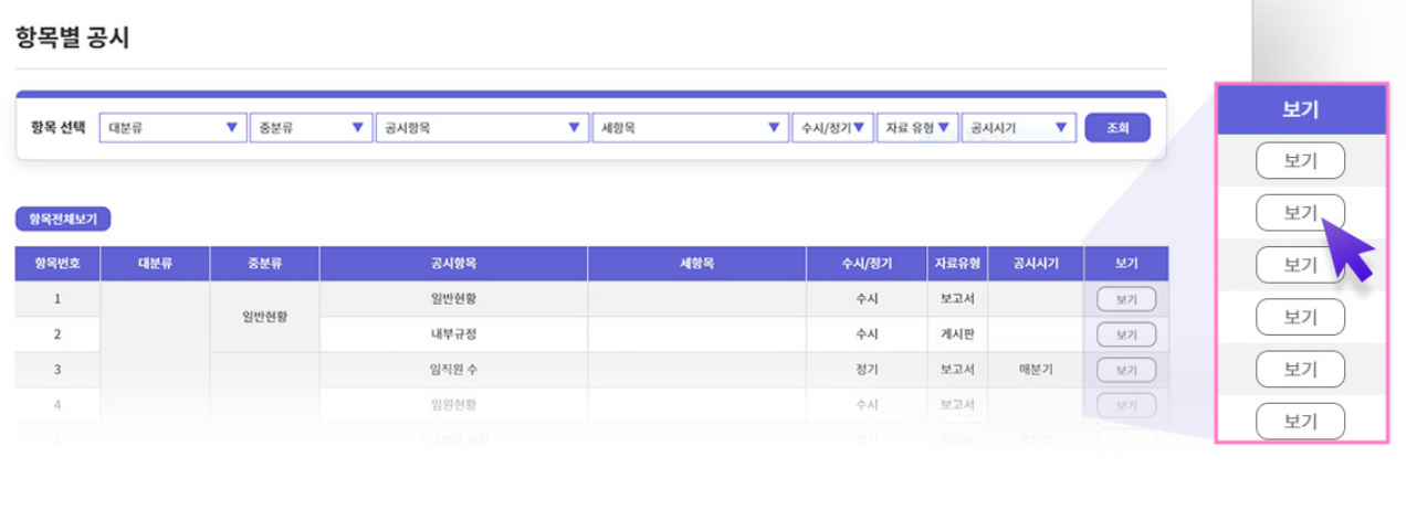 검색 결과에서 원하는 기관명을 클릭하면 연도별로 구분된 공시 정보가 정리되어 있으며, 원하는 연도를 선택해 자료를 확인할 수 있습니다.