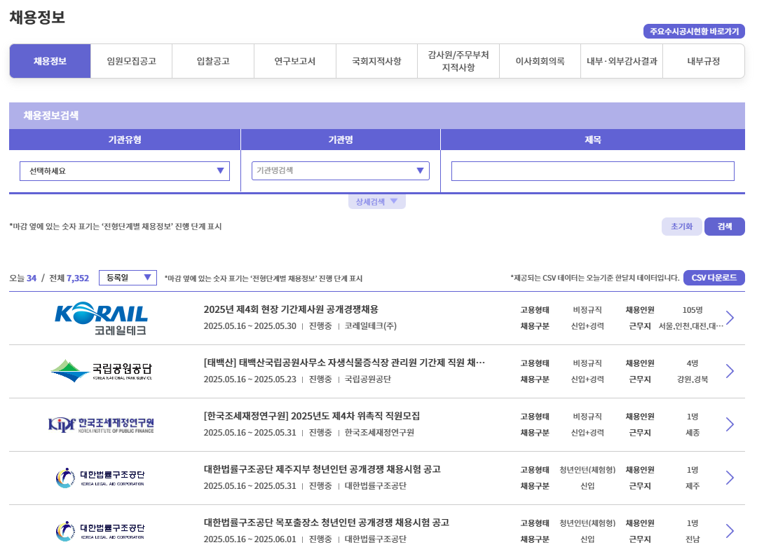 특히 정규직 공개채용뿐 아니라 청년인턴, 기간제, 경력직 채용 등 다양한 형태의 공고가 실시간으로 업데이트되기 때문에, 취업을 준비하는 사람들에게 매우 유용한 플랫폼입니다.