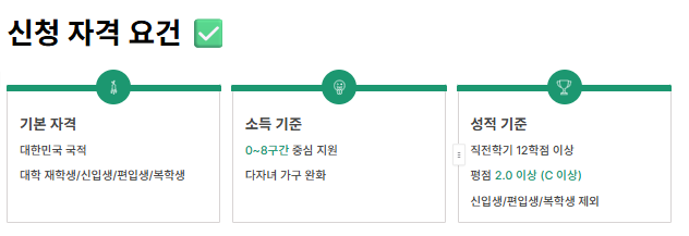 국가장학금은 성적, 소득, 학적 요건을 충족해야 신청 가능합니다.
