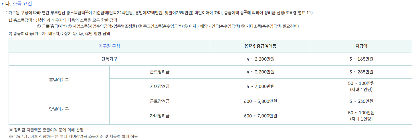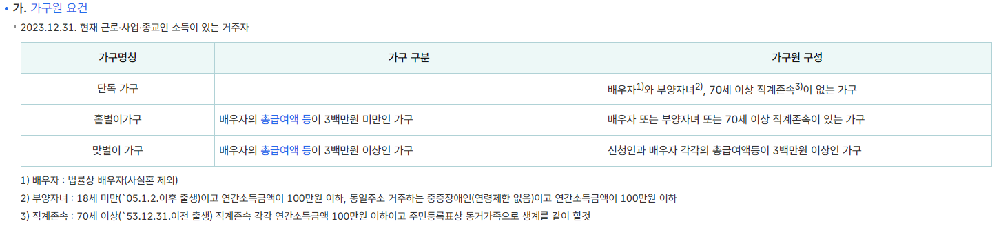 ● 홑벌이 가구: 연소득 7천만 원 이하로, 배우자가 있는 경우 추가적인 요건이 적용됩니다.