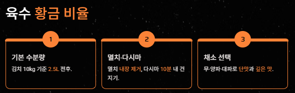 김장김치는 양념과 절임 과정도 중요하지만, 육수의 완성도가 전체 맛을 결정합니다. 김치 양념에 바로 쓰는 육수는 멸치·다시마·각종 채소의 감칠맛을 적절히 우려내야 하며, 너무 진하거나 탁하면 발효가 불안정해질 수 있습니다. 아래 레시피는 실제 김장 현장에서 가장 많이 사용하는 황금 비율로, 초보자도 실패 없이 만들 수 있습니다.