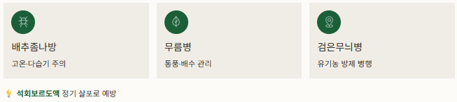 특히 배추좀나방, 무름병, 검은무늬병은 고온·다습기에 발생하기 쉬워 통풍이 잘되고 배수가 원활한 환경을 유지해야 합니다.