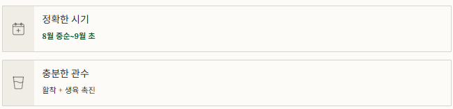 - 남부: 8월 하순~9월 초, 생육 기간 길어 파종 여유 있음