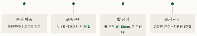 - 파종 후 약 20일 뒤 3~4엽 시 정식