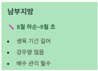 - 남부는 강우·태풍 대비 배수 관리 필수