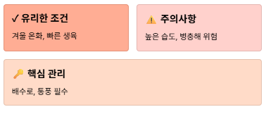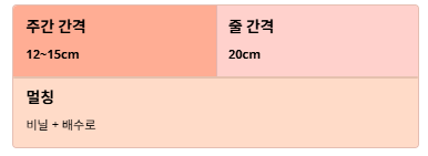 따라서 배수로 확보와 통풍 관리, 정식 후 멀칭 보온이 필수입니다.