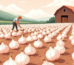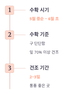 수확은 대체로 5월 중순~6월 초순에 이뤄지며, 구가 단단하고 잎이 70% 이상 마르면 수확 시기입니다. 수확 후에는 통풍이 좋은 곳에서 2~3일 정도 말린 뒤 저장하면 부패를 줄일 수 있습니다.