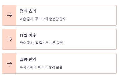 11월 이후에는 관수를 줄이고, 서리가 내리기 전 짚 덮기 또는 부직포 피복으로 보온을 강화합니다.