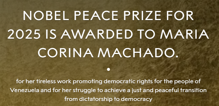 1. 2025년 노벨평화상은 베네수엘라 야권 지도자 마리아 코리나 마차도에게 수여되었다.