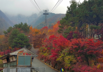 짧은 시간에 대둔산의 단풍 전경을 한눈에 볼 수 있으며, 케이블카 창문 너머로 펼쳐지는 붉은 단풍 아래의 암봉 풍경이 압권입니다.