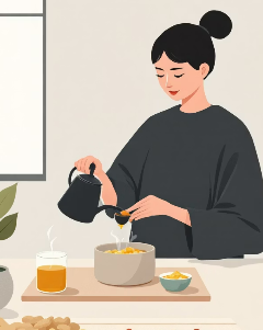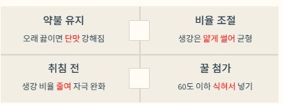 - 생강은 얇게 썰어 향과 온열 효과를 균형 있게 조절