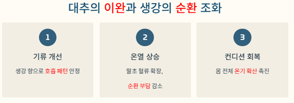 이는 대추 효능 글의 "항산화·장 건강"과 전혀 다른 관점으로, 생강의 온열·기류 개선·순환 활성 중심으로 완전히 분리되는 내용입니다.
