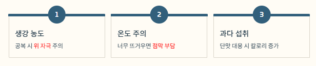 - 공복 시 생강 농도가 강하면 위가 자극될 수 있음