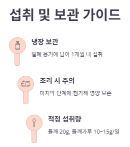 - 하루 섭취량: 들깨 20g, 들깨가루 10~15g