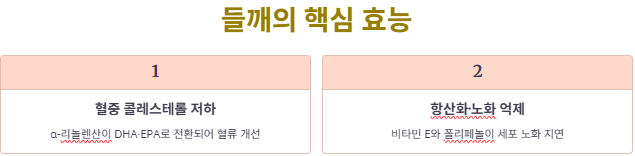 들깨의 핵심 효능은 혈중 콜레스테롤 저하입니다. 들깨 속 α-리놀렌산이 체내에서 DHA·EPA로 전환되어 중성지방을 줄이고 혈류를 깨끗하게 유지시켜줍니다.