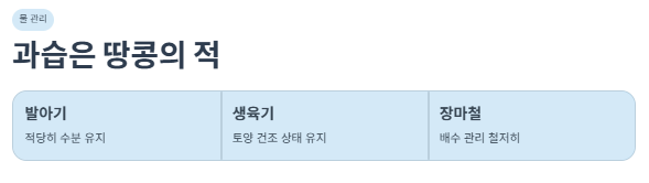 특히 땅콩은 물이 고이는 환경을 매우 싫어하기 때문에 배수 관리와 흙의 입자가 중요한 핵심 요소입니다.