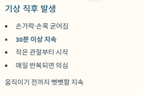 아침 강직 증상의 특징을 정리하면 다음과 같습니다.
