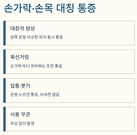 예를 들어 오른손 검지 관절이 붓고 아프다면, 왼손 검지 관절에서도 비슷한 통증이 함께 나타나는 양상입니다. 이러한 대칭성은 단순한 사용 과다나 외상과 구별되는 핵심 신호로 볼 수 있습니다.