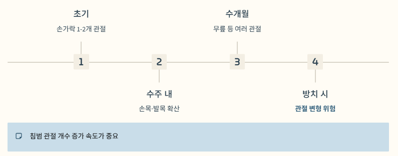 특히 통증의 강도보다 침범되는 관절의 개수가 늘어나는 속도가 중요합니다. 증상이 빠르게 넓어지거나, 아침 강직과 전신 피로가 함께 심해진다면 적극적인 치료가 필요한 단계로 볼 수 있습니다.