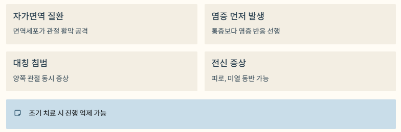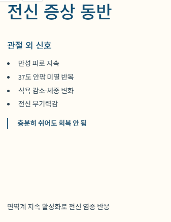 - 관절 증상 외에 피로, 미열 등 전신 증상 동반 가능