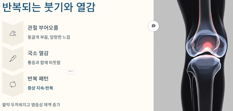 초기에는 하루 이틀 정도 증상이 나타났다 사라지기도 하지만, 같은 관절에서 붓기와 열감이 반복된다면 단순한 관절 피로로 보기는 어렵습니다. 특히 외상이나 과사용 없이도 이러한 변화가 나타난다면 주의가 필요합니다.