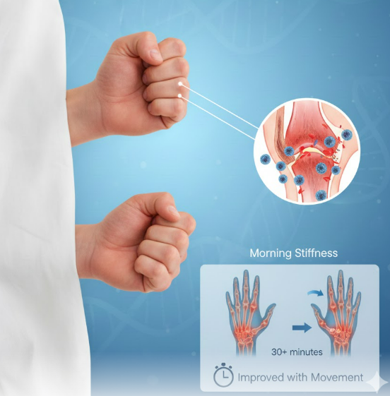 류마티스 관절염의 가장 대표적인 초기증상은 아침에 관절이 굳는 듯한 강직 현상입니다. 잠에서 깬 직후 손가락이나 손목, 발가락이 뻣뻣해 움직이기 어렵고, 일상적인 동작을 시작하기까지 시간이 필요합니다.