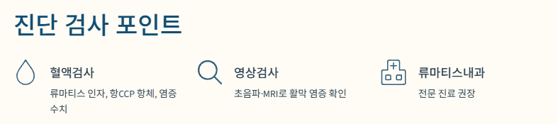 혈액검사에서는 류마티스 인자, 항CCP 항체, 염증 수치 등을 확인하며, 관절 초음파나 MRI를 통해 관절 내부 활막 염증 여부를 살펴봅니다. 단순 X선 검사에서는 초기 변화가 보이지 않을 수 있어 정밀 검사가 중요합니다.