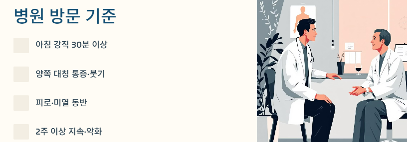 이러한 아침 강직은 염증이 밤사이 활발해지면서 관절 내부에 염증 물질이 축적되기 때문에 발생합니다. 단순 피로나 일시적 통증과 달리 지속성과 반복성이 핵심 판단 기준입니다.