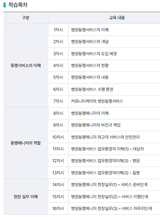 - 특징: 병원동행매니저 자격증 교육과정을 제공하며, 온라인 강의와 학습 지원을 제공합니다.