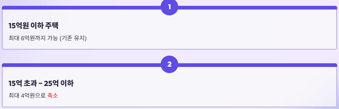- 15억 초과~25억원 이하 주택: 최대 4억원으로 축소