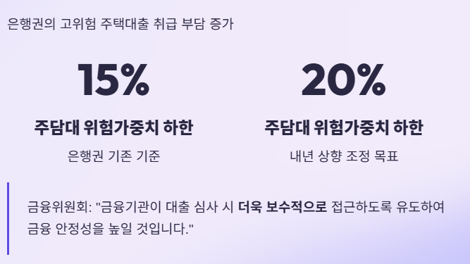 금융위는 내년부터 은행권 주담대 위험가중치 하한도 15% → 20%로 상향하여, 금융기관이 고위험 주택대출을 취급할 때 부담을 더 높이도록 조정했습니다. 이로써 금융기관은 대출 심사 과정에서 더욱 보수적으로 접근할 것으로 보입니다.