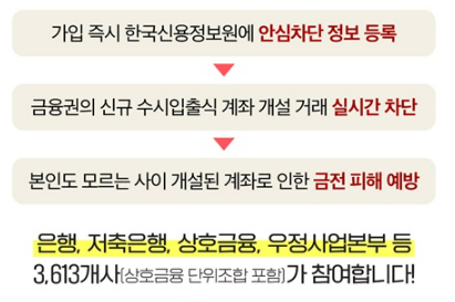 안심차단 서비스는 비대면 계좌개설 시 자동 또는 수동으로 특정 위험 거래를 차단하거나 알림을 제공하는 보안 기능입니다.