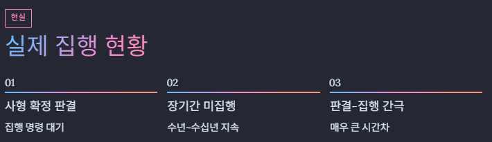사형은 판결이 확정되더라도 곧바로 집행되지 않습니다. 사형 집행은 별도의 행정 절차와 집행 명령을 필요로 하며, 이 과정에서 오랜 시간이 소요될 수 있습니다. 실제로 사형 확정 판결 이후에도 집행이 이루어지지 않은 채 수년 이상 대기 상태가 지속되는 경우가 많아, 사형은 판결과 집행 사이의 간극이 매우 큰 형벌로 평가됩니다.