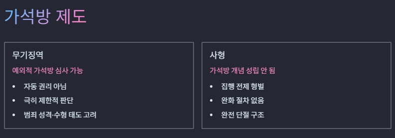 - 무기징역: 생존을 전제로 자유를 장기간 제한하는 형벌