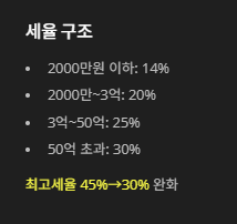 이전과 비교하면 최고세율이 45%에서 30%로 낮아지는 구조이기 때문에, 고배당 종목에 투자하는 주주 입장에서는 실질적인 세금 절감 효과가 매우 큽니다.