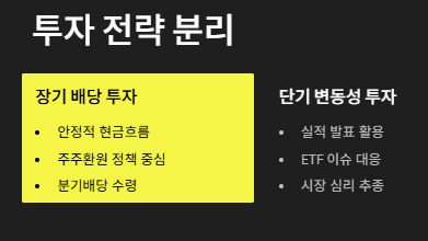 투자 전략은 명확히 나뉘어야 합니다. 장기 투자자는 배당과 주주환원 정책을 중심으로 안정적인 현금 흐름을 노리는 전략이 적합하고, 단기 투자자는 실적 발표, ETF 이슈, 시장 심리를 활용한 변동성 매매 전략이 필요합니다.
