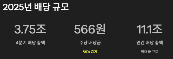 이번 2025년 4분기에는 기존 분기 배당 2조4500억 원에 더해 1조3000억 원 규모의 결산 특별배당이 추가되면서, 분기 배당 총액이 약 3조7500억 원으로 확대되었습니다.