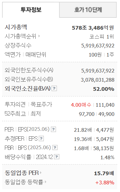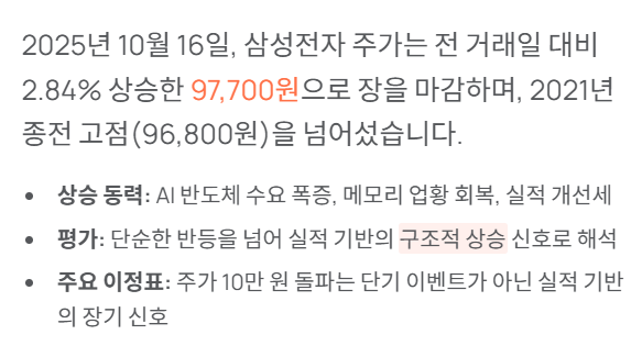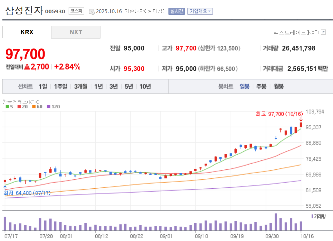 - 2025년 10월 16일, 삼성전자 주가 97,700원으로 사상 최고가 경신