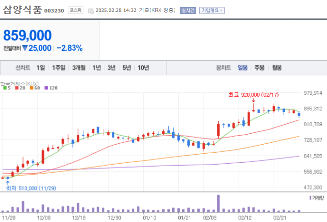 2. 삼양식품 주가 현황 (2025년 2월 27일 기준)