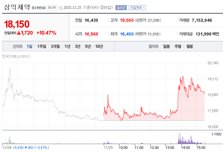 삼익제약 주가는 11월 25일 기준 장중 강한 매수세 유입과 함께 급등 흐름을 보였습니다. 25일 시장에서 삼익제약은 전일 대비 큰 폭으로 상승했고, 거래량 역시 하루 만에 크게 증가했습니다.